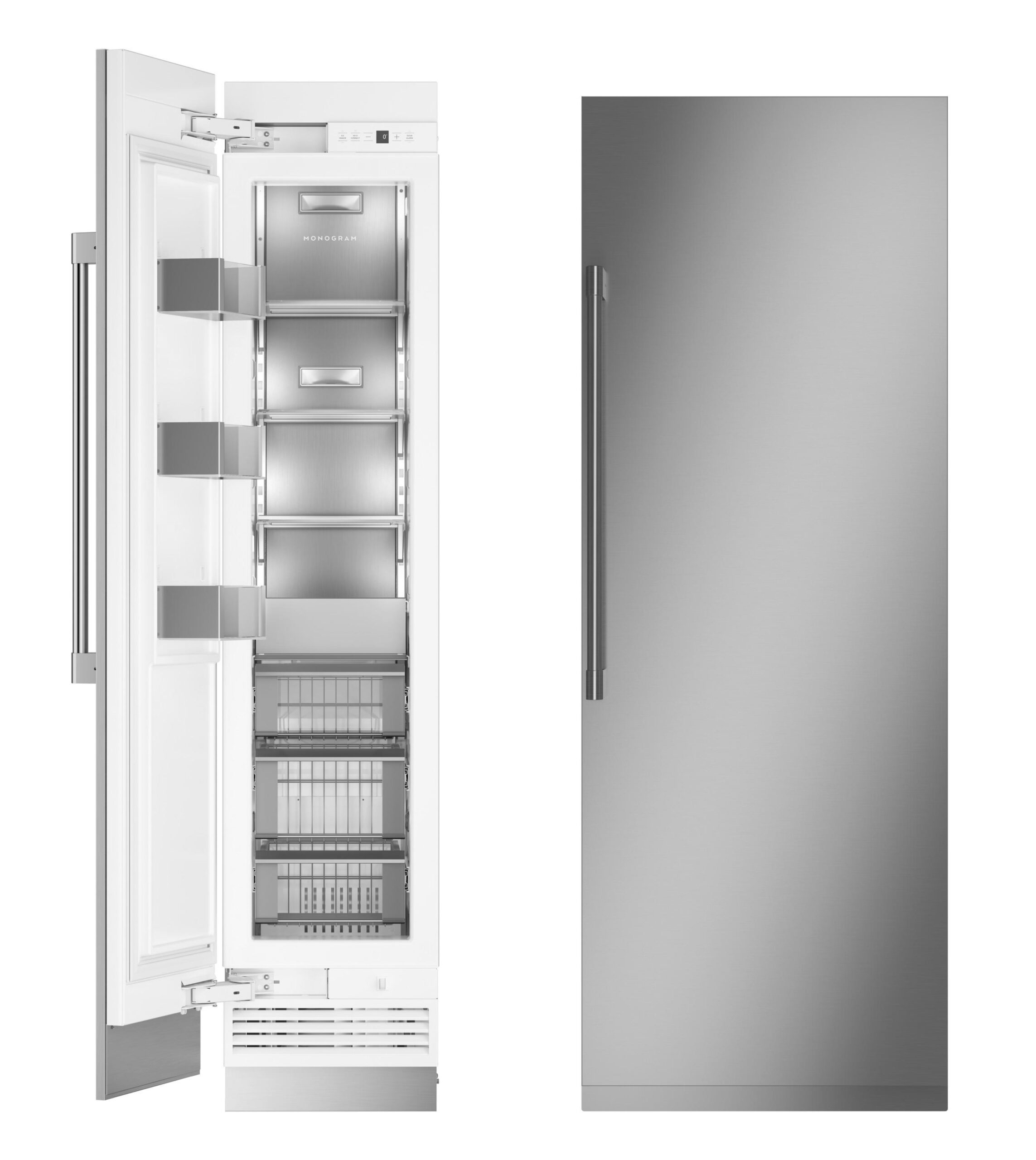 Fully integrated column designWith concealed hinge offers a look of seamless perfection that installs flush with surrounding cabinetryStatement and Minimalist Collection Refrigerator Handles (sold separately)Designed to enhance choice and customization, Statement and Minimalist Collection refrigerators do not come with handles. Handles must be chosen separately and ordered through a Monogram representativePanel-ready exterior with six-way adjustabilityAccepts Statement or Minimalist Collection stainless steel panels ordered separately from Monogram or custom panel & handle from your cabinet makerRetrofit capabilityAllows you to replace a 48" or 42" built-in side-by-side refrigerator with two column refrigerators with no cabinet or electrical modificationsFinely crafted, adjustable aluminum door bins with glass accentsOffer easy access to quick-grab itemsAdjustable glass shelves with integrated LED lightingProvide convenient storage and a clean appearanceRemote connectivity via WiFiAllows you to wirelessly control freezer settings from your smartphone, using an available appRemovable ice storage and multiple slide-out binsProvide added convenienceWater filtration systemSupplies you with clean, fresh-tasting ice cubesUpfront, electronic-touch controlsMake it easy to adjust climate settings to create ideal food storage conditionsRamp-up LED interior lightingThroughout the freezer compartment accentuates the sophisticated interior and allows easy viewing of contentsDedicated evaporator sealed systemHelps maintain a precise temperature throughout the freezer compartmentEnhanced Shabbos ModeThe Shabbos Keeper connects to your refrigerator to automatically enable Shabbos compatible modes each week and before every holiday (Shabbos Keeper sold separately, visit www.zmantechnologies.com for details)
